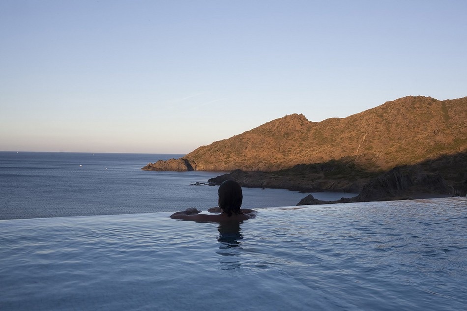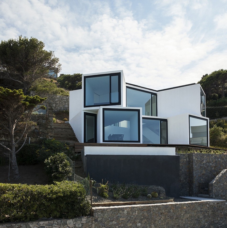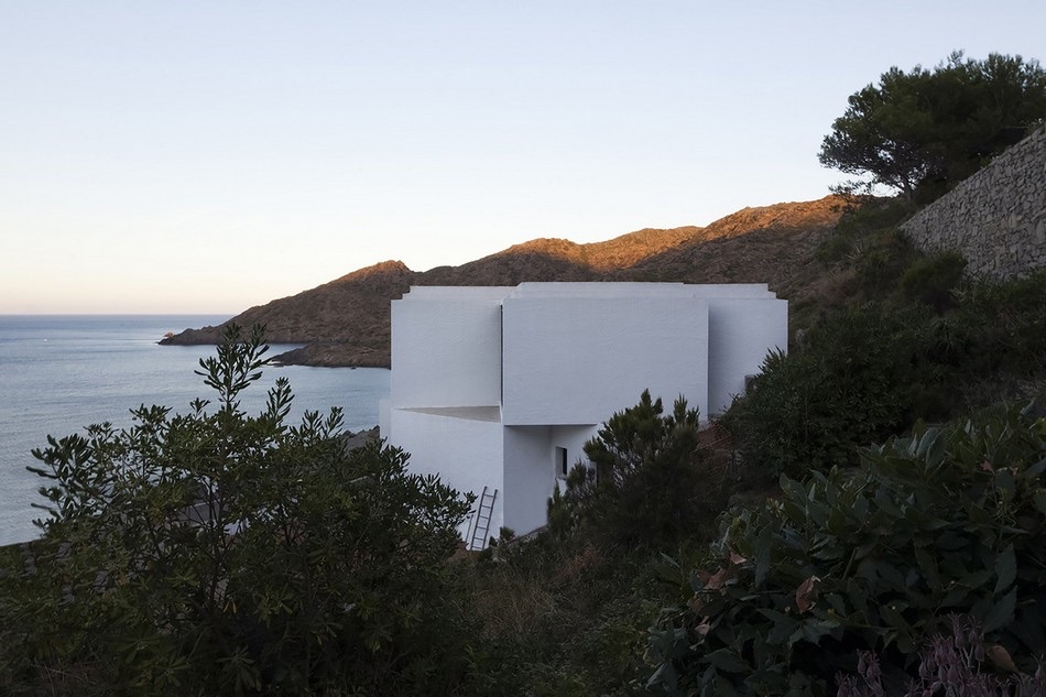-Espagne, El Port de la Selva (à trois pas de la France)- Une falaise surplombant la mer, des vents à dresser le poil et une création « apéricube » blanche de haute volée imaginée par le studio d’architecte Cadaval & Solà-Morales : La Sunflower house.