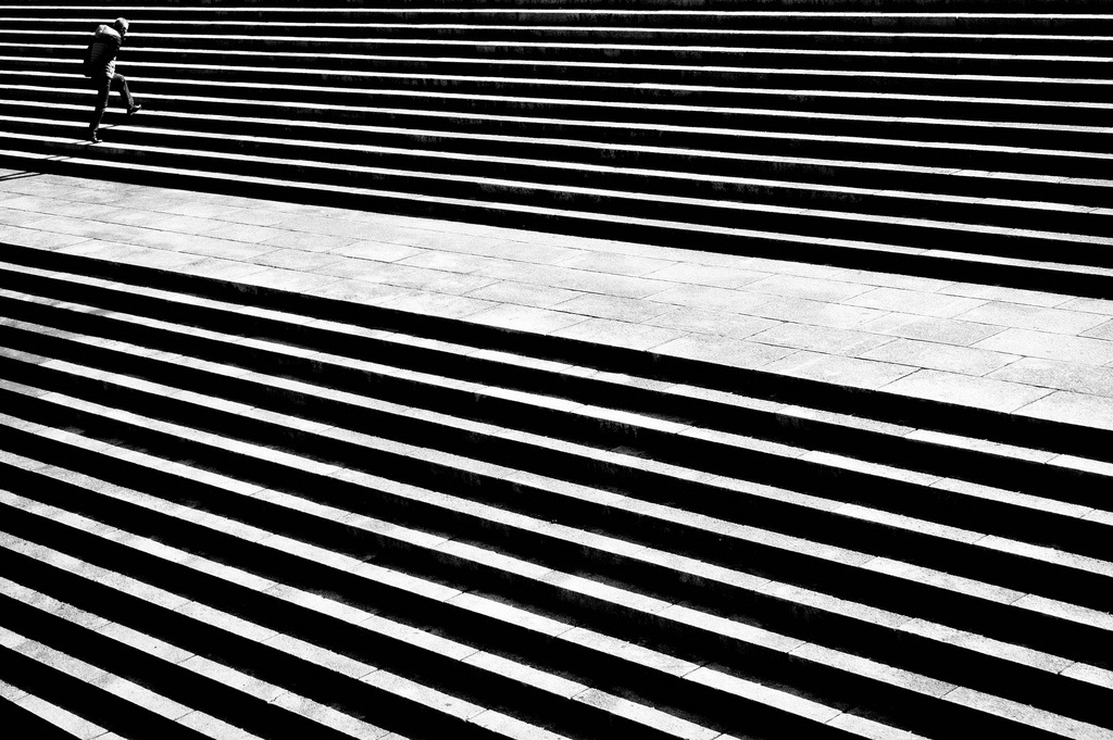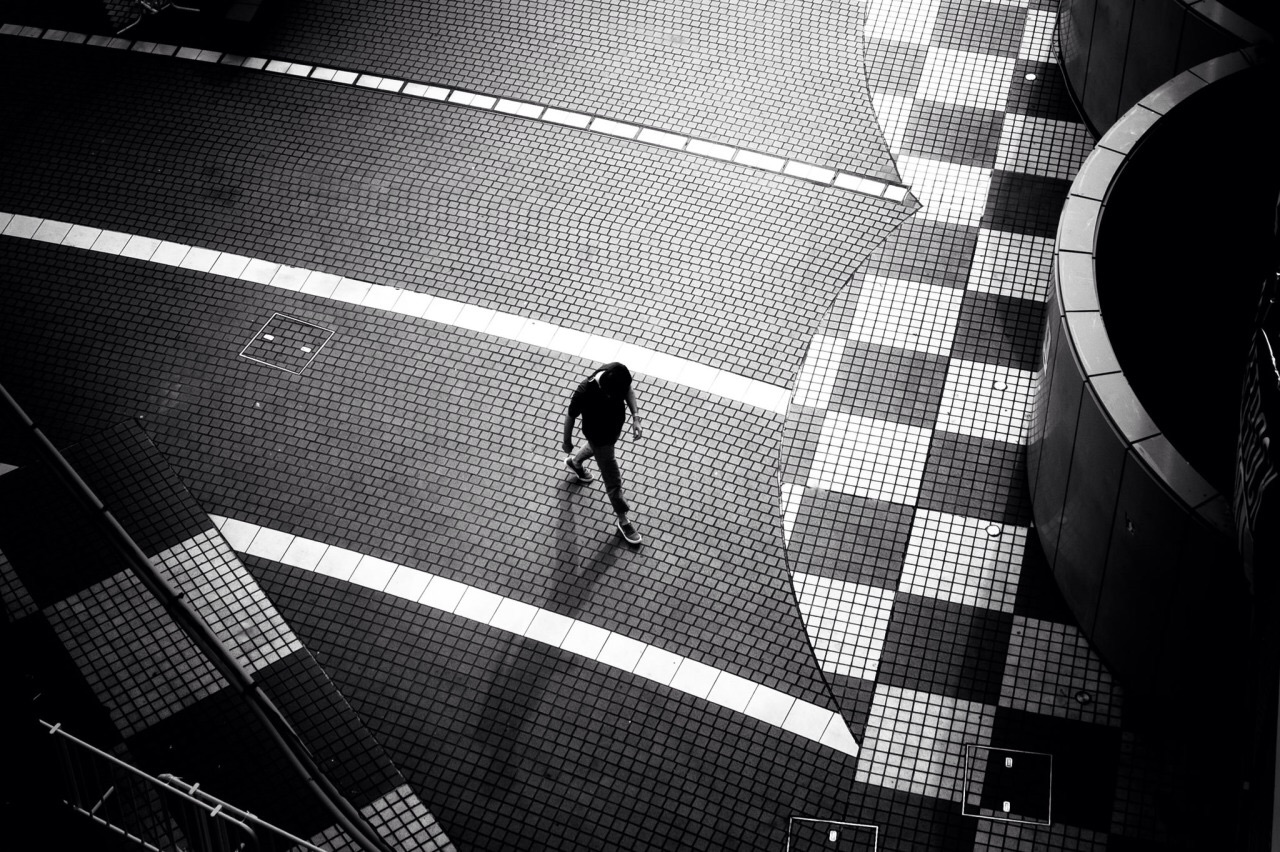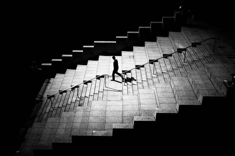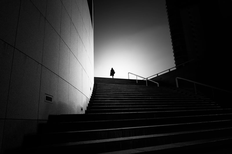 Il joue au jeu du chat et de la souris avec le noir et blanc, sans artifices et tralala si ce n’est un contraste à l’alambiqué. Deux maîtres mots nappent son style : sobriété et puissance. Junichi Hakayoma est un illusionniste des rues, sous l’emprise de son objectif, les escaliers lambda gagnent en finesse et perspective alors que les ruelles au sol en damier et autres architectures métalliques, révisent leur symétrie oubliée.