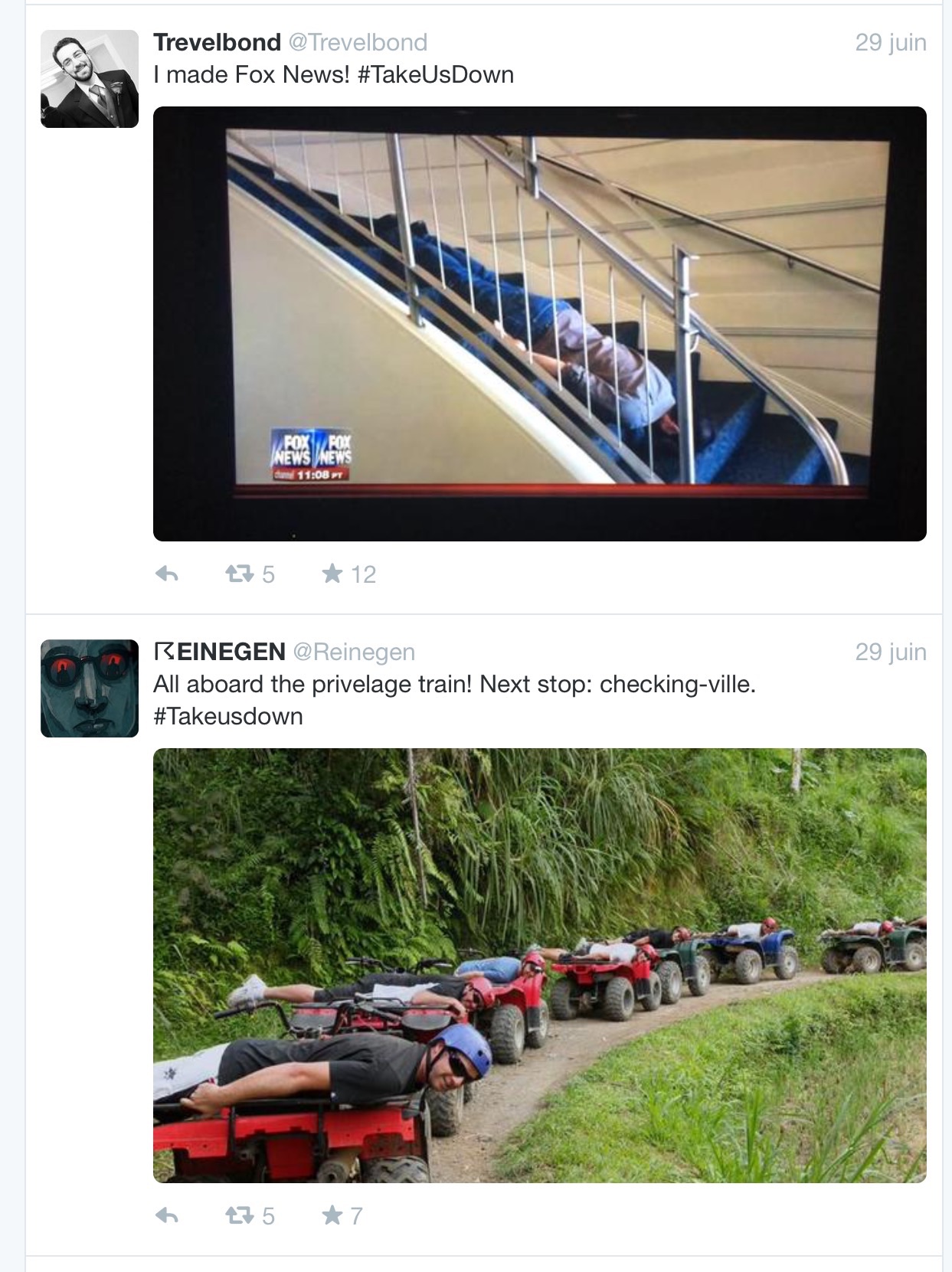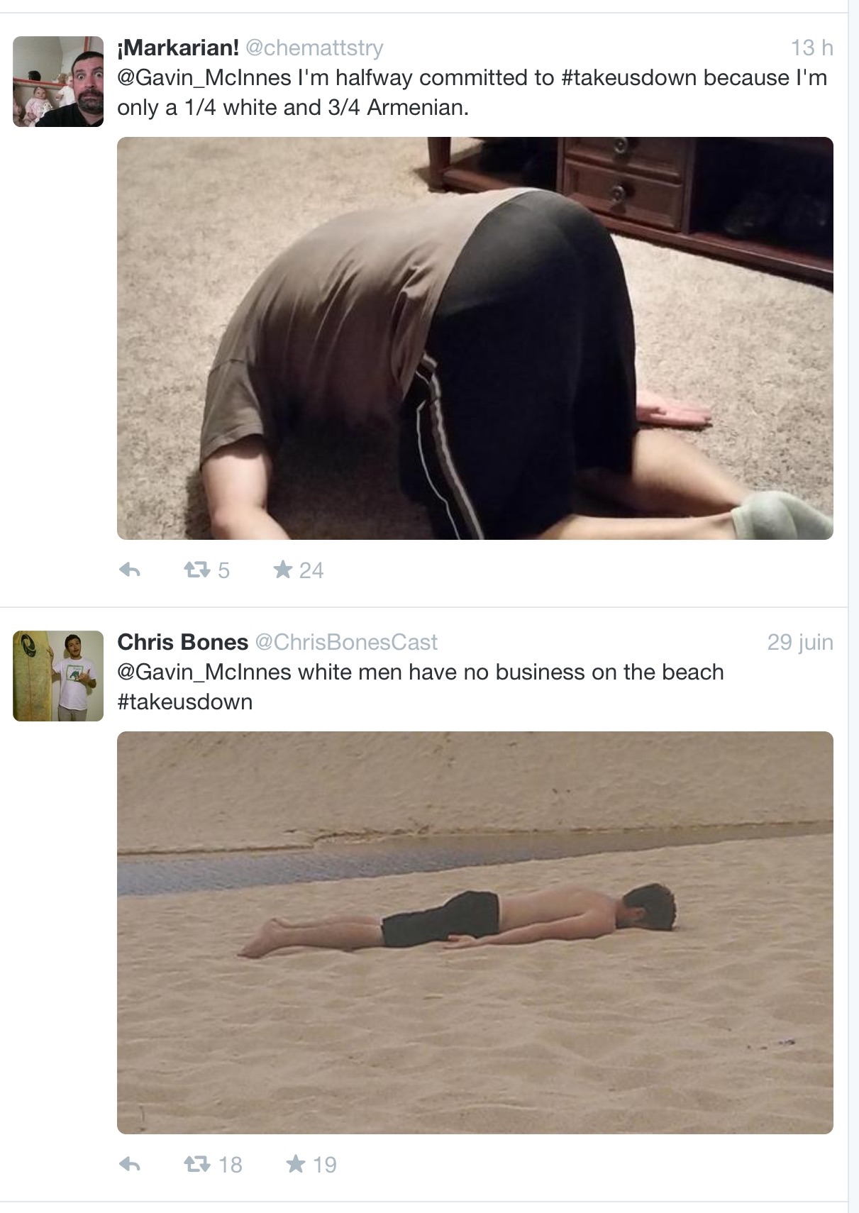 #TakeUsDown, la nouvelle campagne twitter initiée par Gavin McInnes « tenterait » de calmer les esprits après la tuerie de Charleston en s’engageant avec humour sur le terrain sensible de l’oppression et des privilèges des Blancs aux Etats-Unis. Quoi de plus efficace que l’auto-dérision afin de bousculer l’opinion? Ainsi des centaines de photos de personnes « faces contre terre » pullulent sur le réseau social depuis quelques jours, la plupart du temps agrémentés de commentaires cocasses, même les bébés y participent!