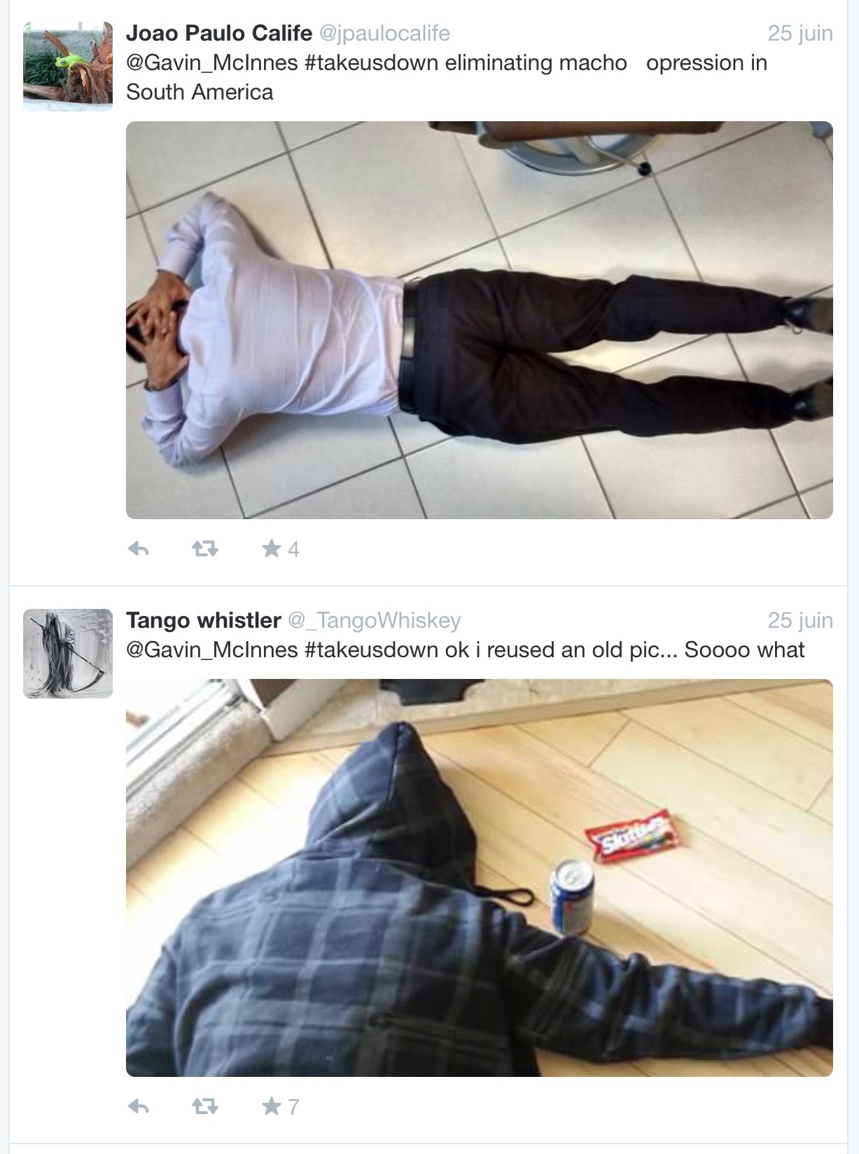Blancs>Noirs, NON ! Le Zemmour musclé, hipster raciste et machiste made in Usa, co-fondateur du magazine Vice, Gavin McInnes a lancé sur Twitter une campagne hashtag TakeUsDown, où les Blancs s’auto ridiculisent en photos. Le but : Faire un pied de nez à l’oppression raciale. La mollusque parade est là.