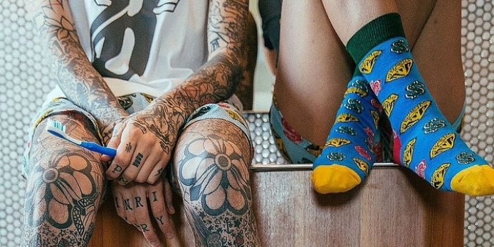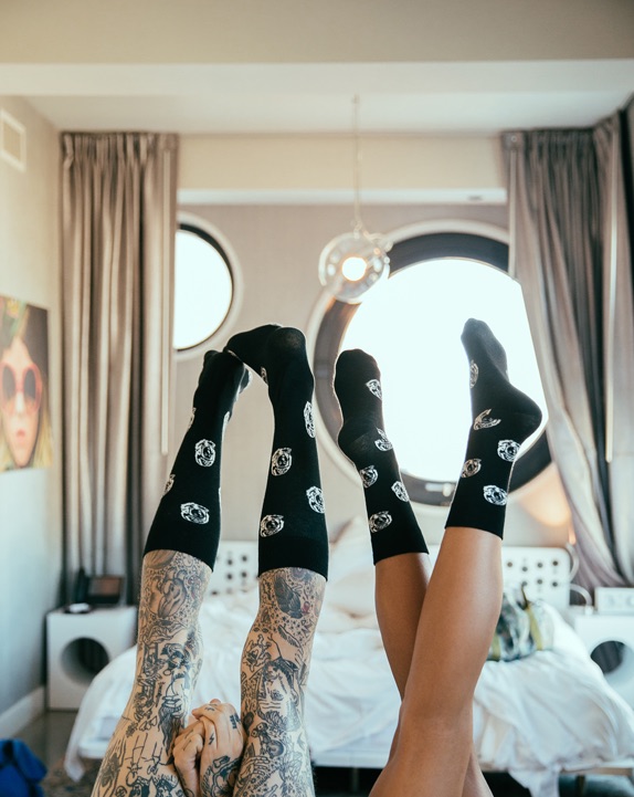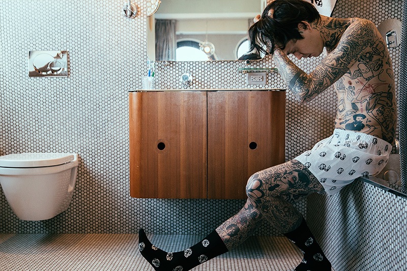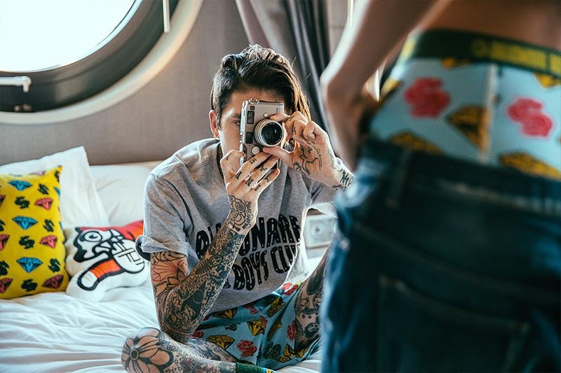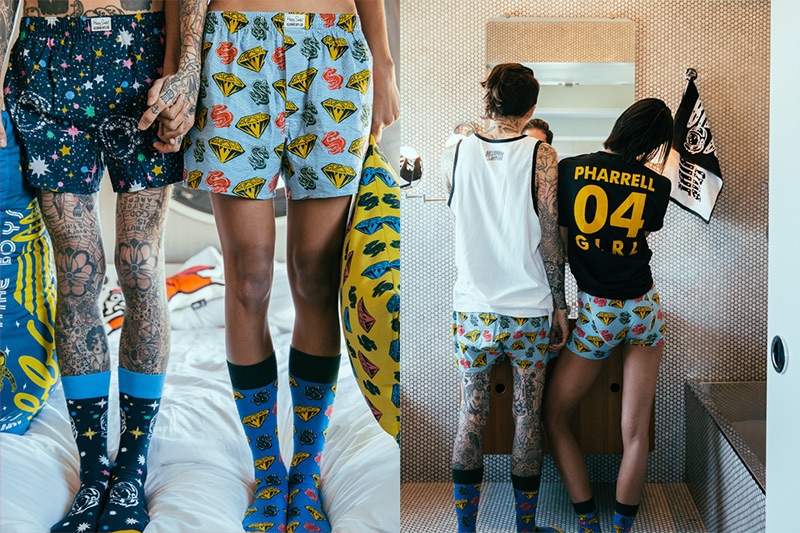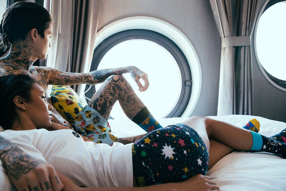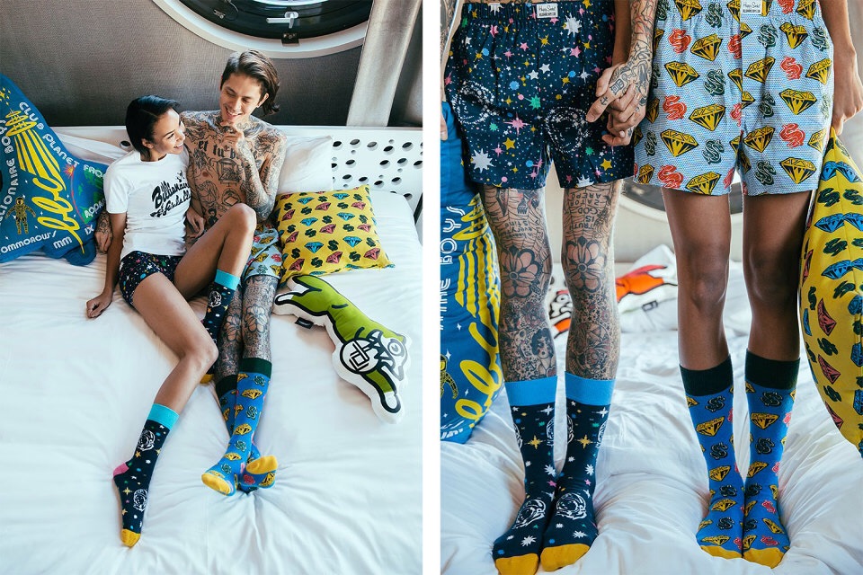 Chaussettes unisex à imprimés en diamants, $$$ de l’oncle Picsou et caleçons en champ d’ėtoiles flashy pour homme, de la griffe du non moins légendaire artiste japonais Sk8thing! Billionaire Boys Club, la ligne de streetwear créée par Pharrell Williams et l’excentrique marque nippone Happy Socks s’allient ici dans une collection capsule pop détonante -limited edition-. Et pour rendre la chose encore plus trendy, un modèle « inked », tatoué fait le zozo sur un lit!