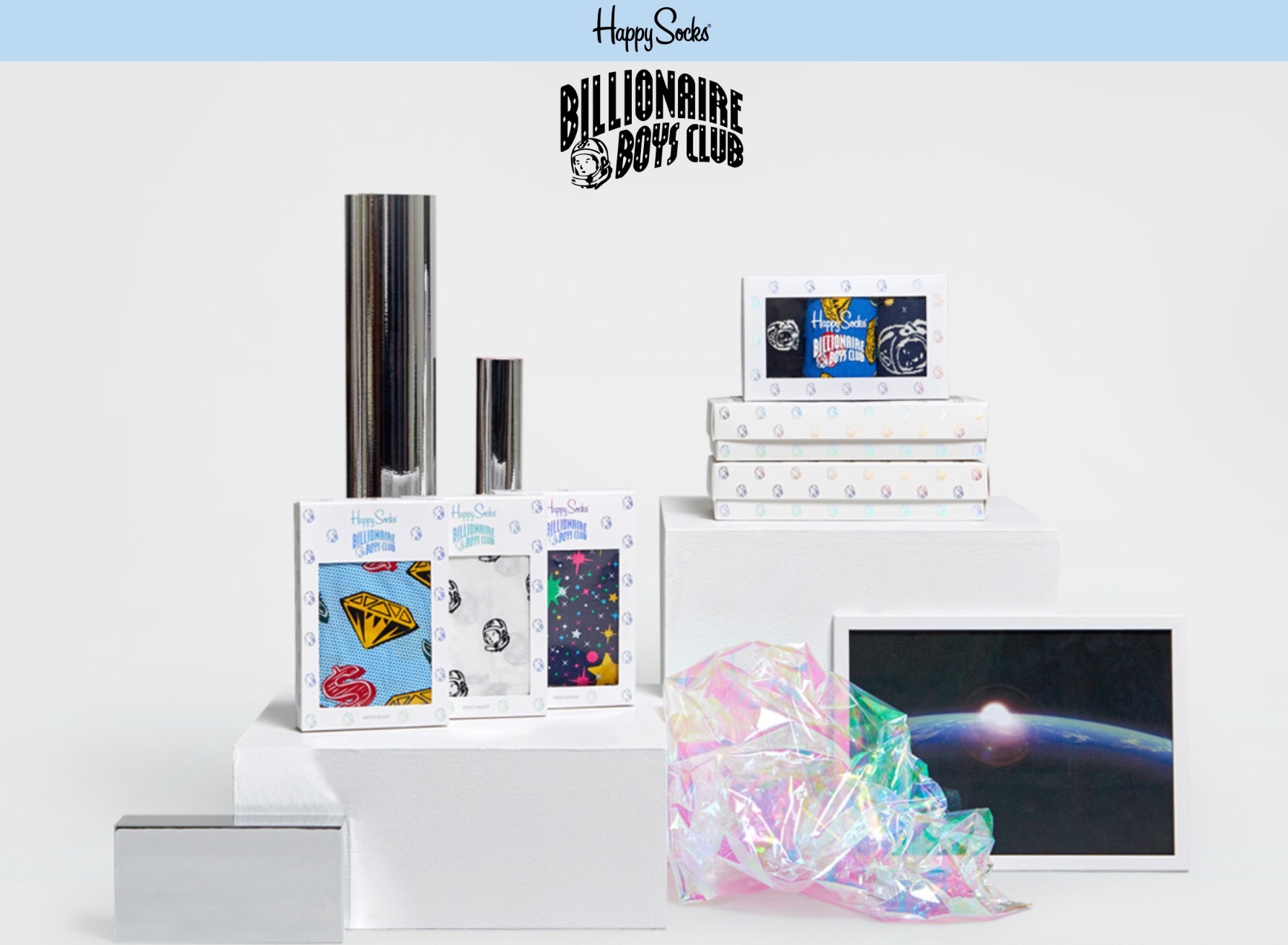 Les articles Happy Socks X BILLIONAIRE BOYS CLUB sont dispo ici séparément ou combinés dans un coffret exclusif. Le pack dispose d’un emballage exclusif en imprimé holographique sur fond blanc!