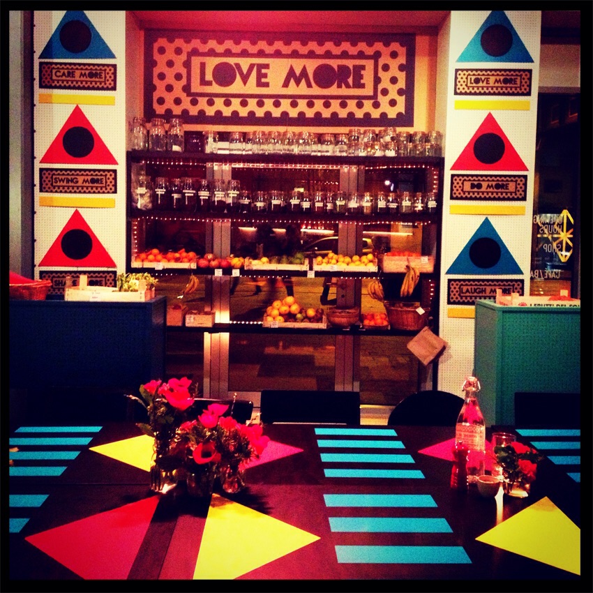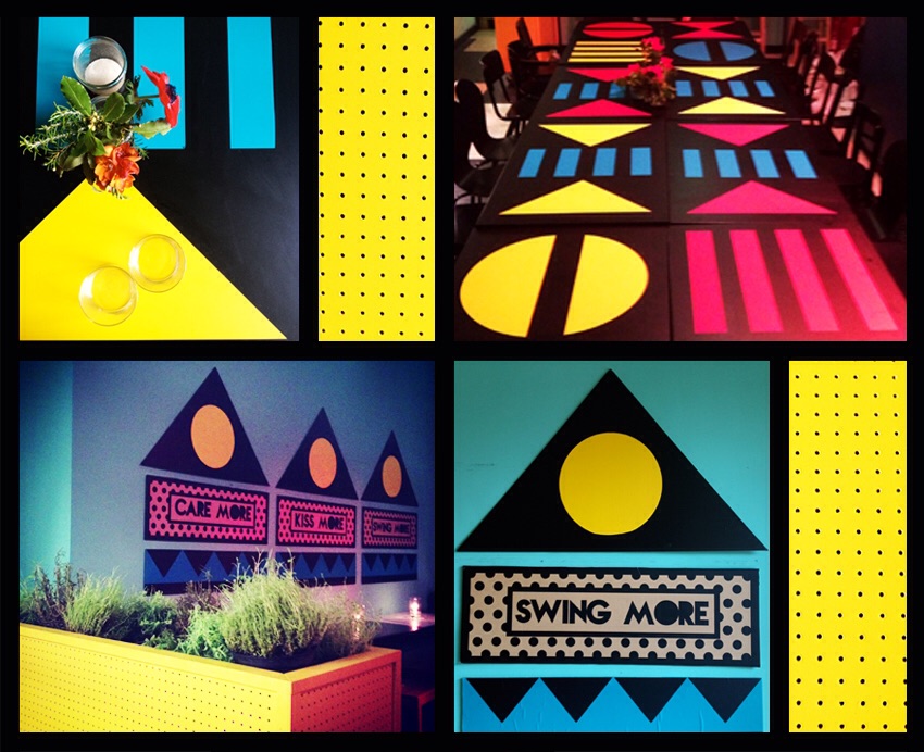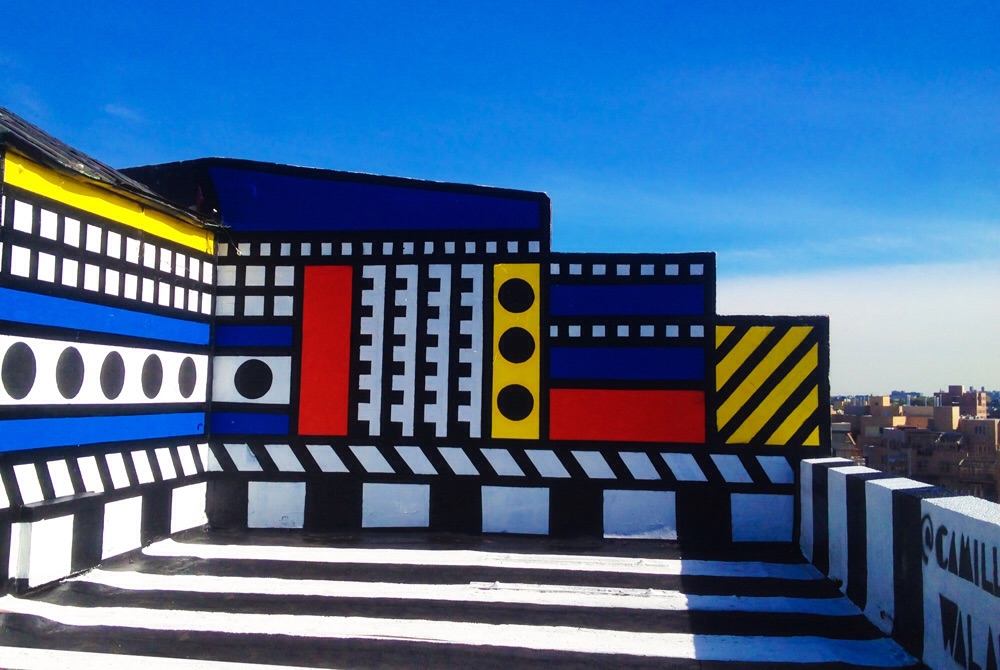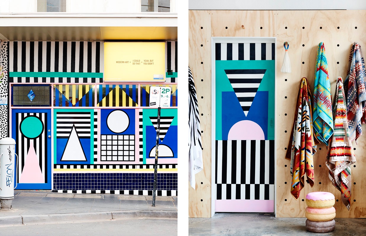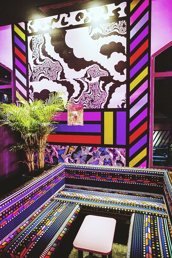 Un arc en ciel de couleurs qui pourrait redonner joie de vivre au peuple grecque! Car ce qui est « beau pour les yeux, pétille dans le coeur ». Cela aurait pu être son mantra mais Camilla Walala a préféré opter pour « vivre le rêve » ou « longue vie au soleil » qu’elle catapulte sur les murs. Artiste française, exilée à Londres, accro au bacon et au design d’intérieur, d’objet et de textile, elle relooke depuis 3 ans avec extravagance et peps les cafés, pop up bars, nightclubs, ou rooftops sur commande, de Londres à Sydney.