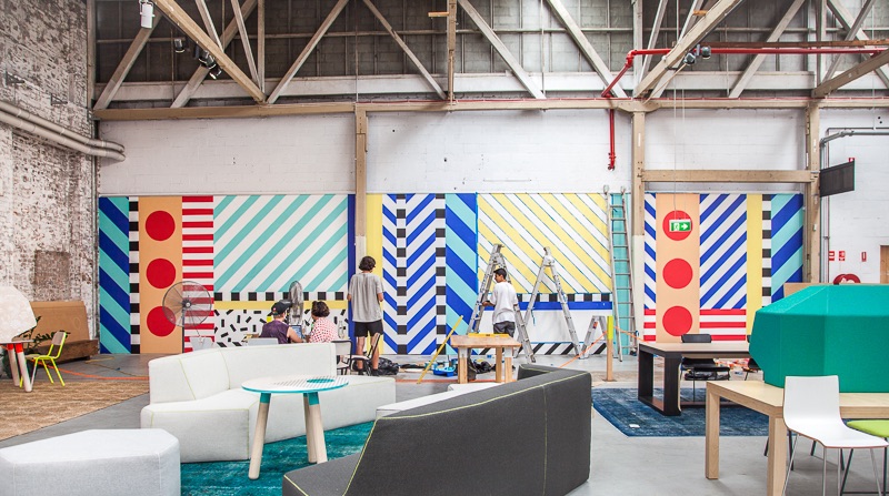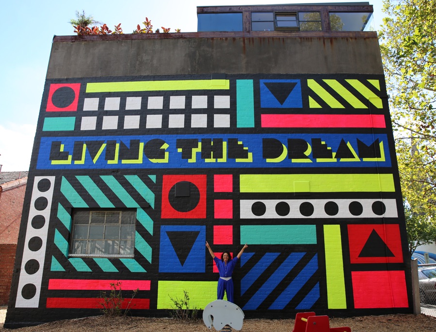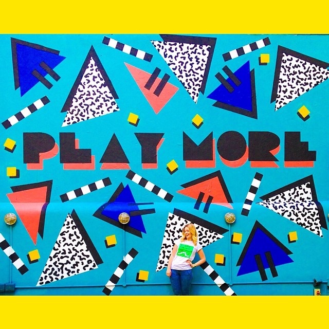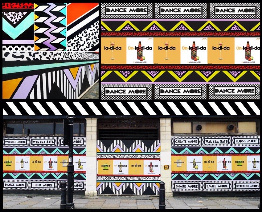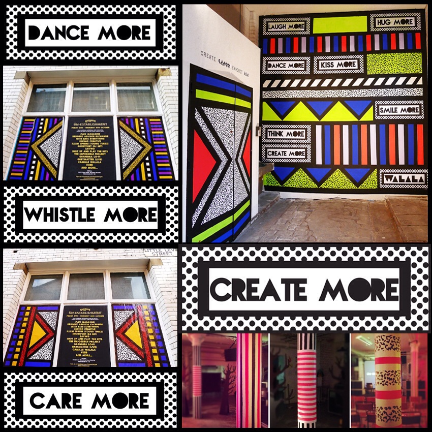 « Embrasse plus », « danse plus », « souris plus », « pense plus », « crée plus », « hip hip hip hourra », ces messages pullulant ici et là dans les rues de l’Est Londonien et d’ailleurs, sont signés Camilla Walala. Armée de son optimisme dégoulinant de couleurs explosives et flashy, cette designer électro-choque les murs d’immeubles moribonds et des intérieurs de cafés, répondant alors avec panache au SOS « maquille moi de chaleur exotique » et ce par une touche singulière 80’s, mixture de motifs africains et de pop culture.