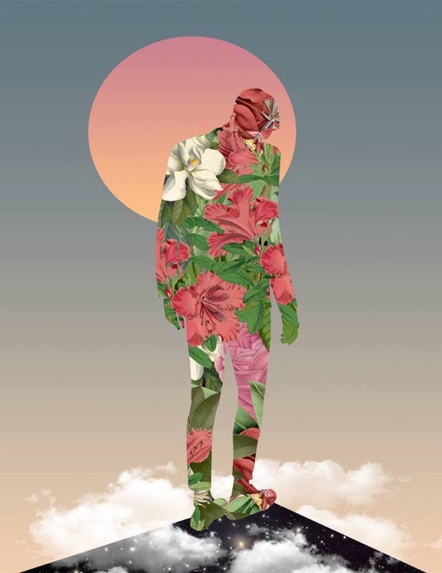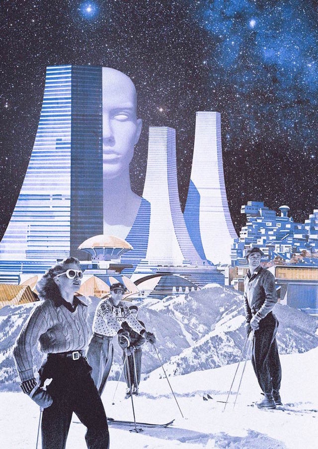 Le ciel, les oiseaux mais pas ta mère. Les références de Mathieu Saunier aka Khan Nova se comptent sur les doigts de 100 mains. Sur ses collages digitaux, se télescopent ainsi stellaire, désert et éthnisme africain souvent en proie aux sables mouvants d’un surréalisme fleuri, découpeur de têtes. Se mêlant de ce qui ne le regarde pas, un vent rétro-futuriste vient alors fermer le sas multicolore des influences offrant l’opportunité à des skieurs d’hier de se pavaner sur des pistes surplombées de grattes-ciel de 2250!