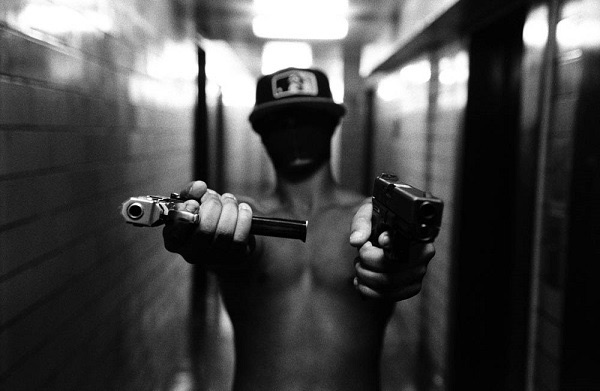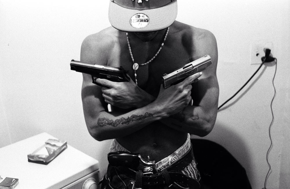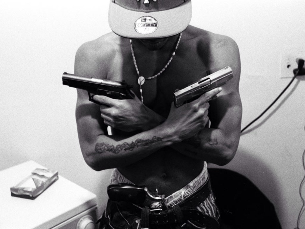 Ses clichés en noir et blanc flirtent souvent avec le photo-journalisme sans basculé un instant dans le putassier… Pitbull, liasses de dollars, junkies, exhibe de tattoos de gang, magnum 147, journée à main armée, vie de famille et enterrements!