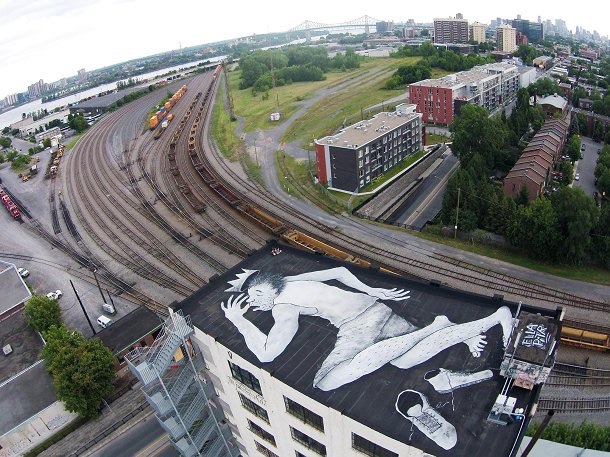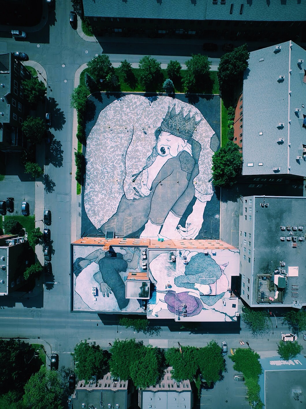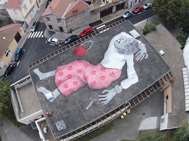 Duo de street artistes stéphanois étincelants avec leurs collages XXL, Ella et Pitr prennent de la hauteur depuis peu, se décollant des murs pour investir les toits du monde, leur projet « Par Terre » en est l’illustration parfaite!