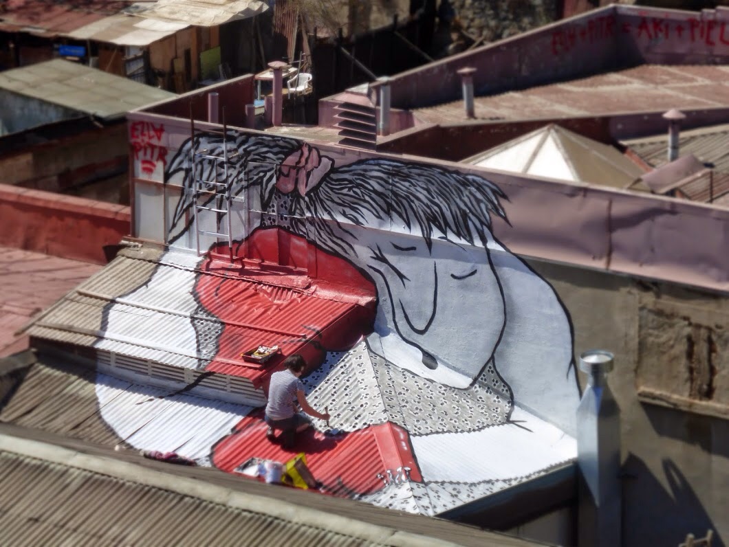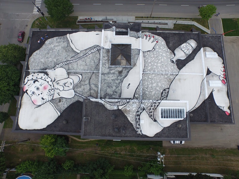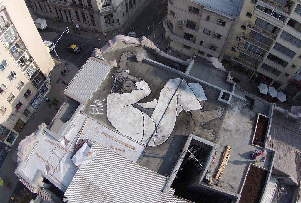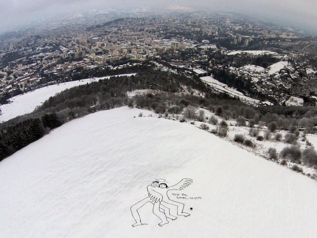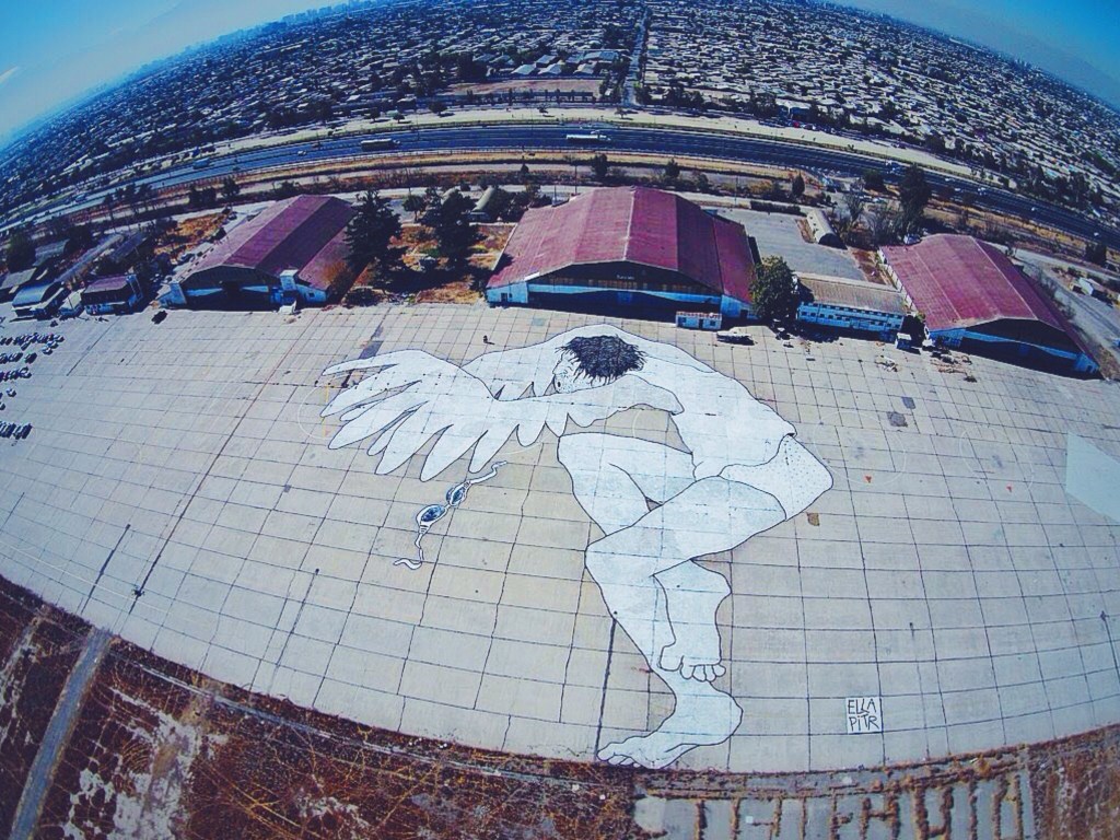 Avis aux oiseaux aficionados de géoglyphes : Obèse en bikini endormie et homme roi ailé en approche! Après avoir glué environ 4000 de leur créations poétiques sur les murs du globe, Ella et Pitr se sont sentis pousser des ailes au point d’avoir filmé avec un drône entre 2013 et 2015, au Chili, au Canada et au Portugal, leur série de dessins « Par Terre », réalisée alors sur le bitume, sur des toits et même dans la neige!