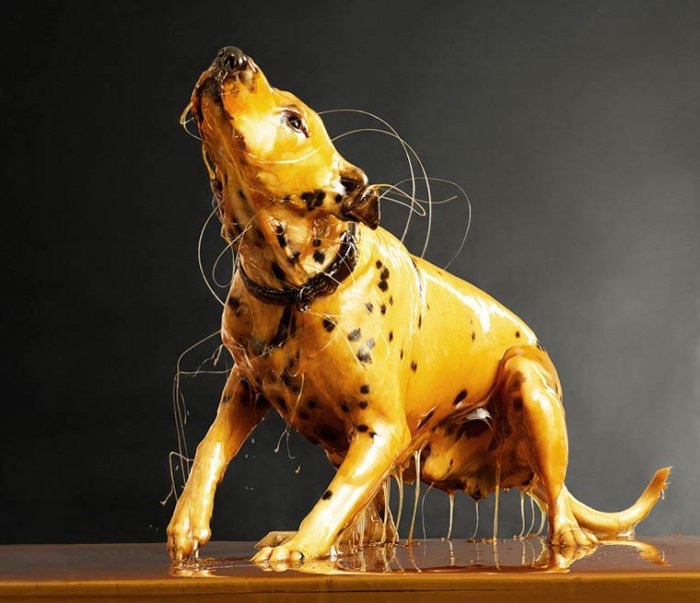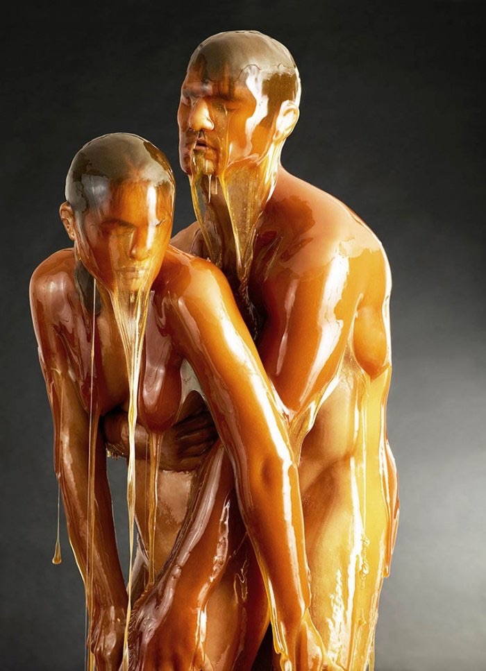 Fasciné par son visuel doré et visqueux, le photographe de Los Angeles a osé l’expérience de la douche de miel sur son armada de mannequins de tout âge et de toute taille, du hispter musclé au bébé en bas âge, tous prenant alors la pose, nus et dégoulinants tel des statues aux prises avec de l’ambre fondue! Ou dans un délire de science fiction, cela s’apparenterait à une extraction esthétique d´une cuve de liquide amniotique artificiel! A coup sûr moins risqué que la cryogénisation!