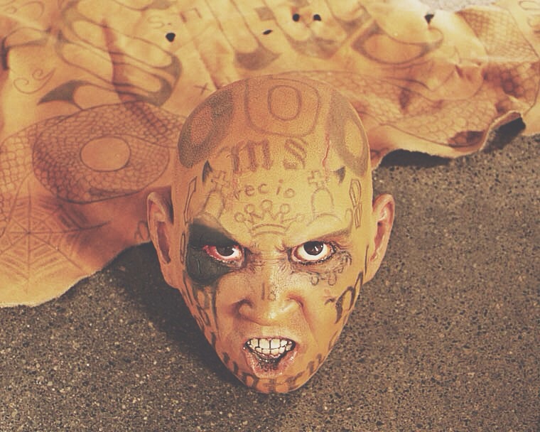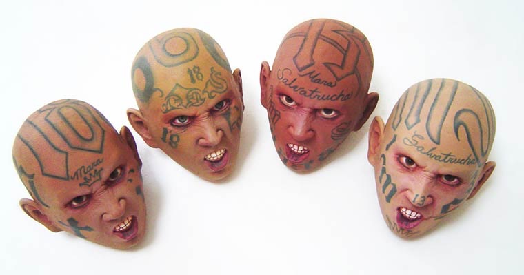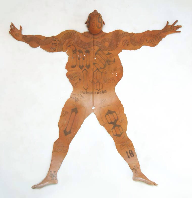 Sa série « Of Genuine Contemporary Beast » met l’accent sur les célèbres gangs MS-13 (Mara Salvatrucha) et MS-18 de Los Angeles, ennemis jurés en guerre depuis les 80s, là où valider son admission revient à tuer un membre de la bande adverse! A travers ces sculptures hyper-réalistes conçues à base de rėsine et d’une vraie peau de bête, l’artiste touche à touche Renato Garza Cervera présente tel un trophée ou un tapis d’appartement un peu glauque, des gangsters tatoués, au corps tout aplati.
