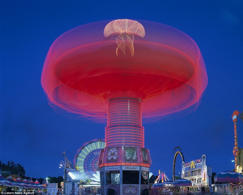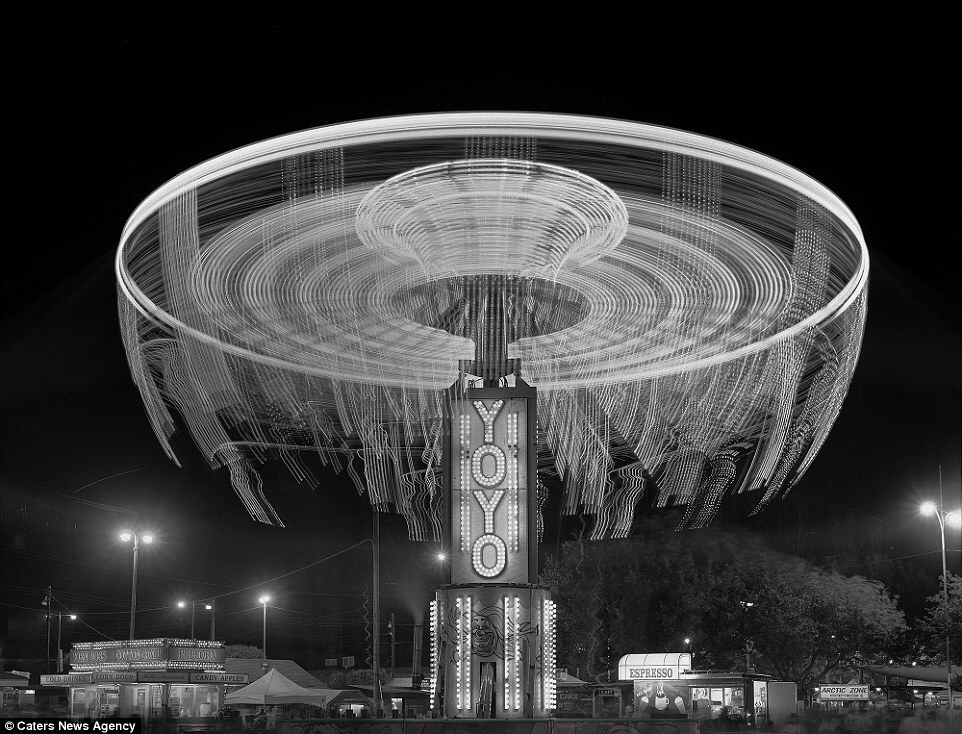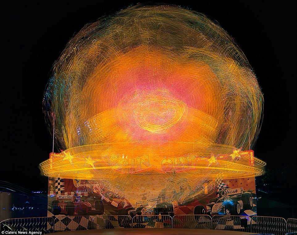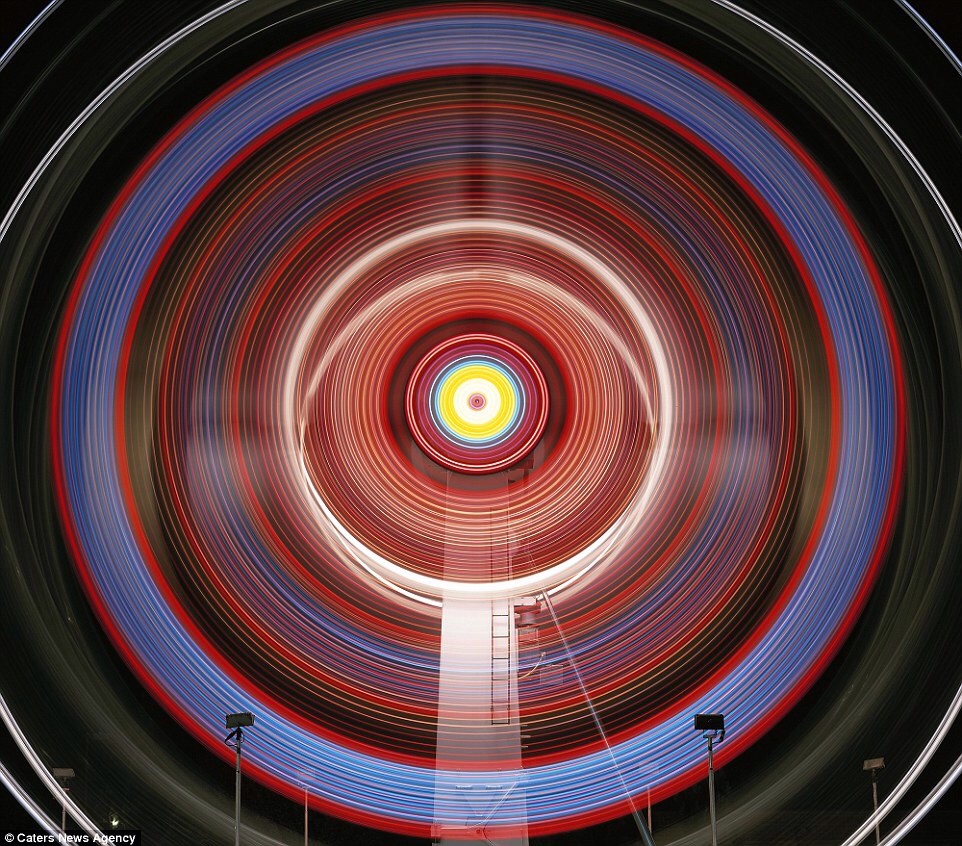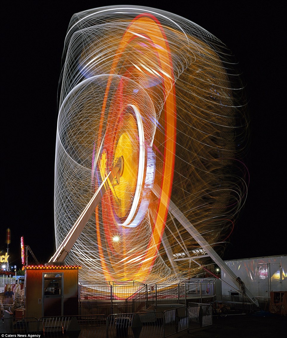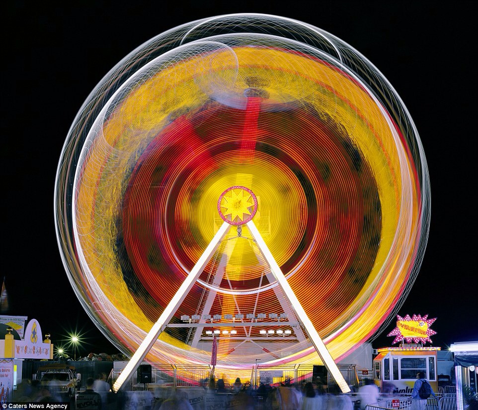 « Il n’y avait aucune inspiration initiale, seulement une expérimentation. Je suis allé faire un tour dans une fête foraine afin de photographier les façades. Puis par curiosité, j’ai décidé de faire une prise de la grande roue avec un long temps d’exposition. La première vue du négatif fut passionnante, alors j’ai continué. La partie la plus fun était alors de ne pas savoir à quoi le résultat final pouvait ressembler « . (Via junk culture)