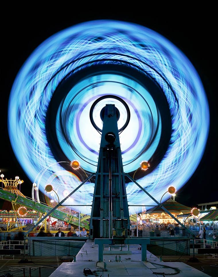 Sa série Carnival, plébiscitée dont le célèbre magazine Life en a fait sa couverture en 2006, hypnotise dans tous les sens du terme, les images propulsent dans un univers rétro-futuriste, où le flux habituellement lancinant de la grand roue se compile ici en une seule scène à l’élan de centrifugeuse cracheuse de lumières!