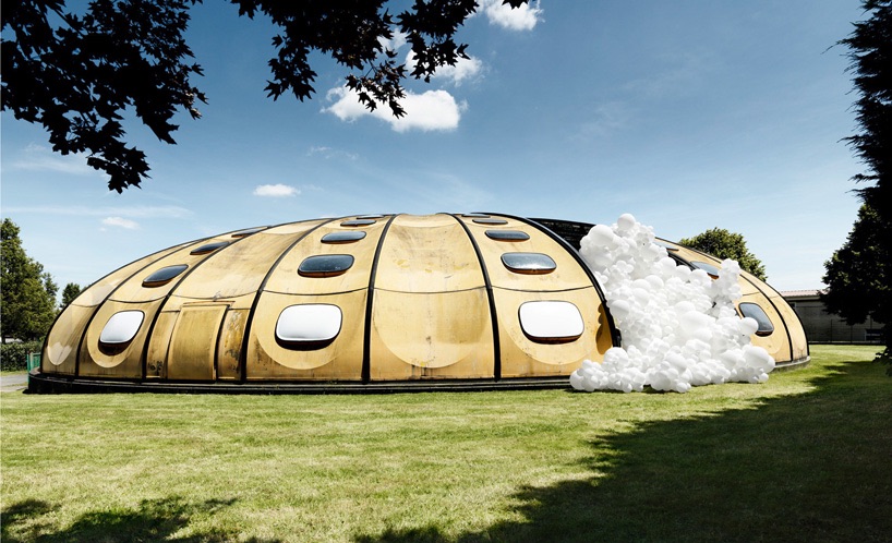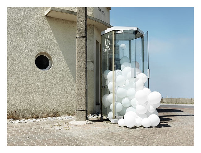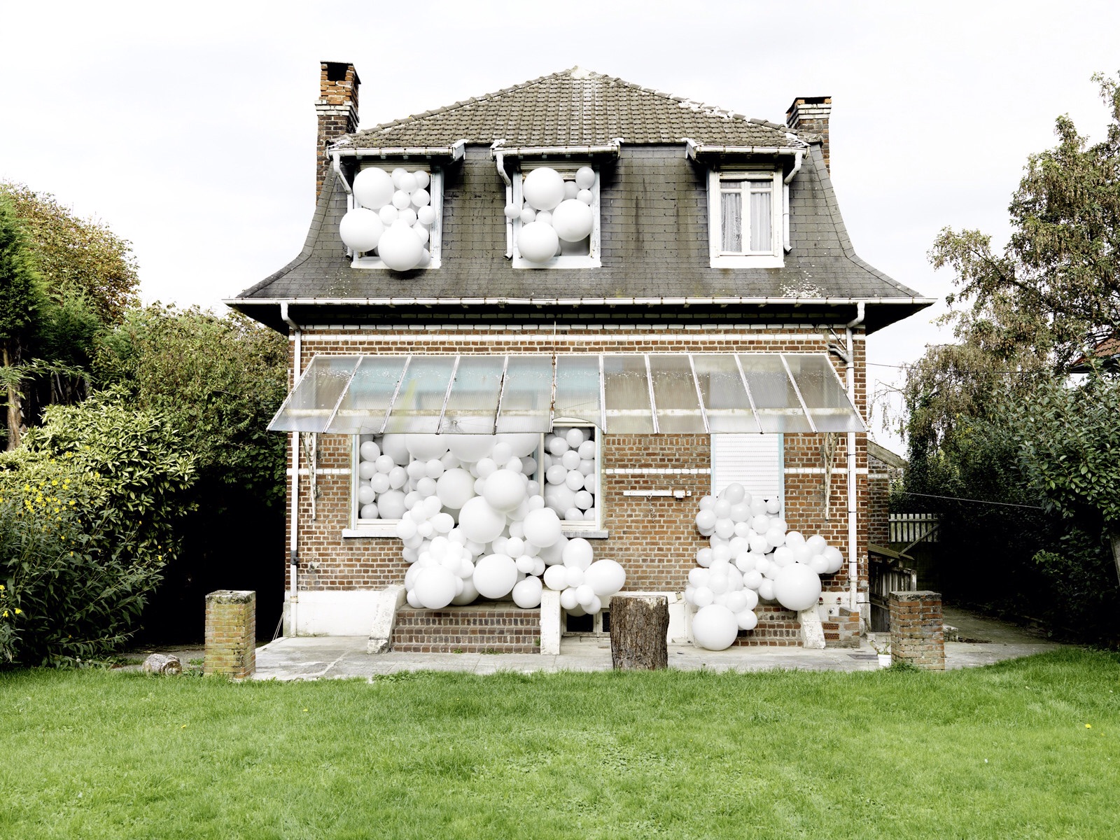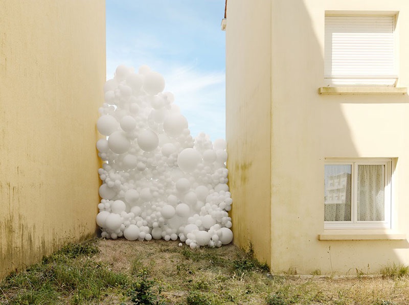 Au delà de leur vertu désaveuglante, ces ballons de baudruche subtilisés à la candeur sucrée de l’enfance, coïtent avec les espaces qu’ils envahissent au point d’en faire de véritable oeuvres esthétiques. Dans sa série « Invasions », un pavillon de banlieue sans âme, un garage banal, une forêt désenchantée, une piscine tournesol, un terrain de basket désert ou une cabine téléphonique d’hier, s’offrent un lifting improbable, troquant leur image émaciée par le temps et l’insignifiance, pour une apparence poétique électrisante et surtout incontournable même pour les mal-voyants!