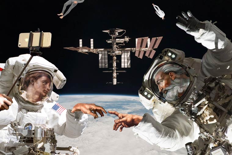Pétage de câble total pour La Joconde et Van Gogh dans les collages de Barry Kite. Il y aussi Zeus en cosmonaute de la Nasa!