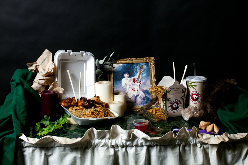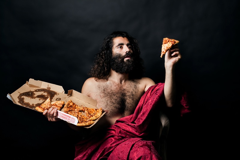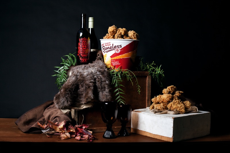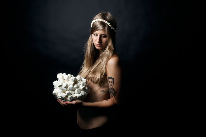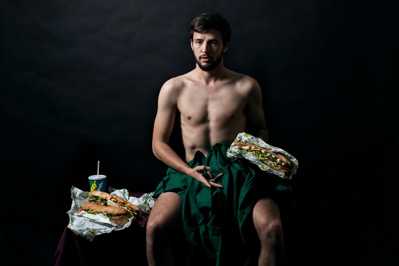 C’est de ce postulat que la photographe d’Hamburg Rebecca Rütten est partie, allant shooter ses amis dans des parures de lumières au charme érotique du XVI siècle, avant de rebattre les cartes avec ironie : Cette fois-ci, exit le vin et les entremets mondains, les instant noodles et pizza industrielles du peuple remplacent le menu des rois! En bref, Leonard de Vinci n’aurait donc pas succombé à un KFC puisque plein aux as!