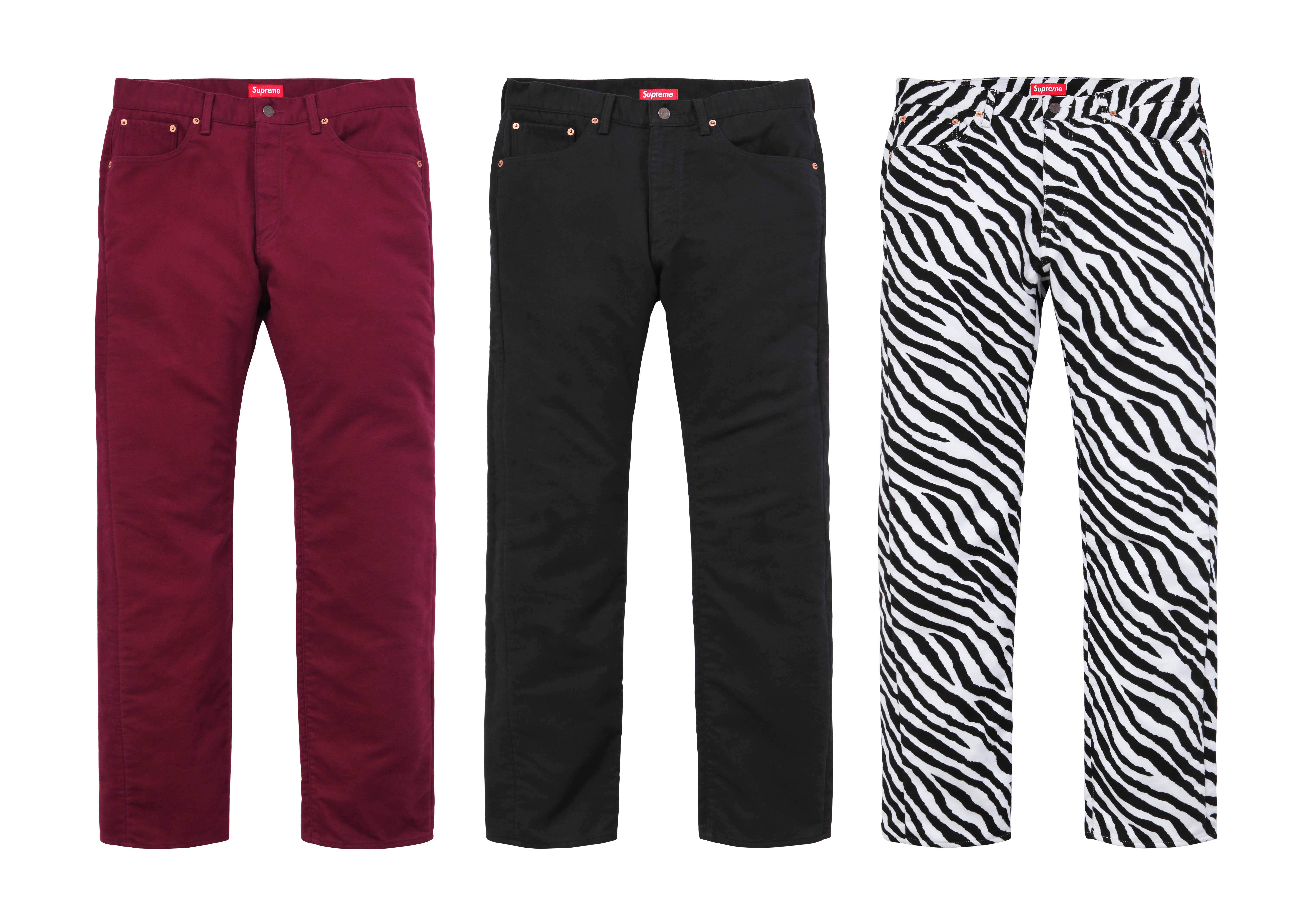Fusion du flair classique de Levi’s et du logo de Supreme visible à l’intérieur des créations, cette quatrième capsule automne/hiver 2015, se compose modestement d’une veste « trucker » Moleskin et d’un jean slim 505, l’ensemble disponible en trois coloris : Bordeaux, noir et zébré.
