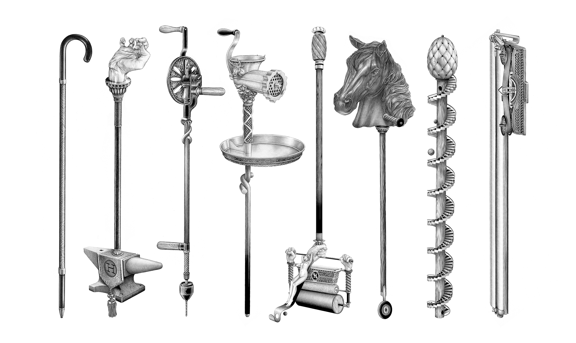 C’est au lendemain de la sortie de son livre d’illustrations murales et démentes « Bicycle » à l’occasion des J.O 2012 de Londres, que la maison de luxe emblématique Hermès a commencé à lui faire les yeux doux. Depuis c’est l’amour fou et les collaborations de haute volée se multiplient, d’abord avec une série de cannes lors de la prestigieuse expo Wanderland, à la Saatchi Gallery de Londres, puis plus récemment avec le premier carré Hermès (écharpe en soie) intitulé « Hippopolis » et réalisé de la propre griffe d’Ugo Gattoni, un changement de medium, du papier à l’objet et un passage à la couleur, qui n’ont aucunement dénaturé son pedigree fantaisiste et sa touche aux frontières du réel.