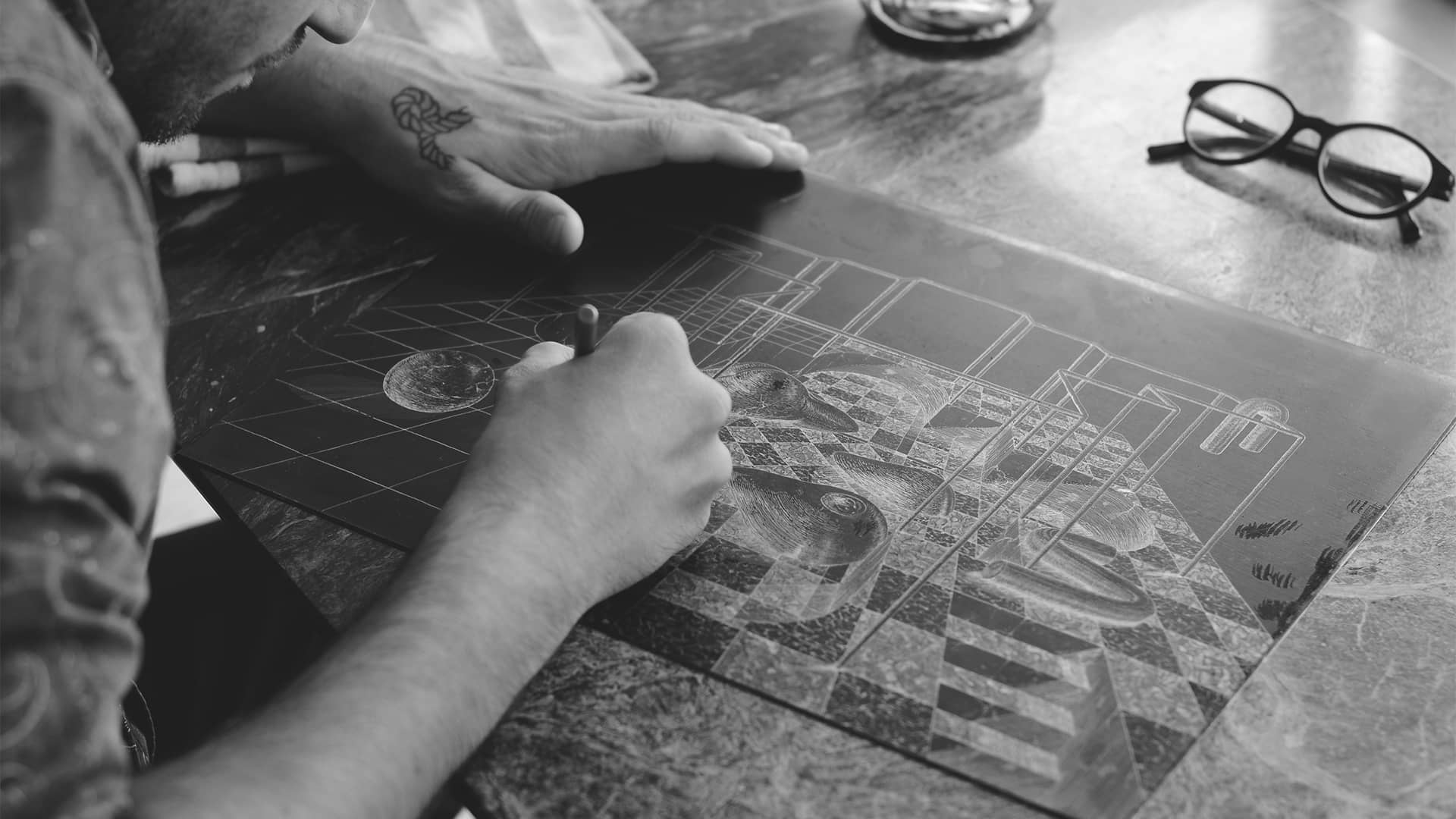 Main dans la main avec Hermès dont il est membre officiel et auteur de la cover de l’album « Panic » de Caravan Palace, l’illustrateur parisien Ugo Gattoni est un boulimique de dessins au crayon, un poil surréalistes et supra minutieux!