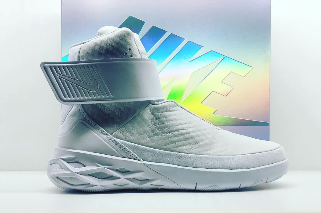 Ultra futuriste et dans la lignée directe de l’Air Mag de « Retour vers le Futur », la pépite intrigante et nouvelle signature de l’acteur Kevin Hart, nargue avec sa silhouette montante, sa sangle proéminente et sophistiquée à la cheville, sans oublier sa semelle unique, son talon sculpté tel un astéroïde et son upper minimaliste au blanc tonale.
