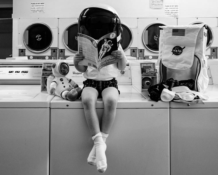Dans son projet Small Steps Giant Leaps, le photographe américain Aaron Sheldon capture sa progéniture âgée de 4 ans déguisé en cosmonaute de la Nasa et visiblement plutôt à l’aise dans l’exercice de sa nouvelle mission, celle d’un rêve de gosse matérialisé ici les pieds sur terre, à défaut de pouvoir virevolter en apesanteur! Mais derrière cette série esthétique et attendrissante, se cache en revanche un message particulier :