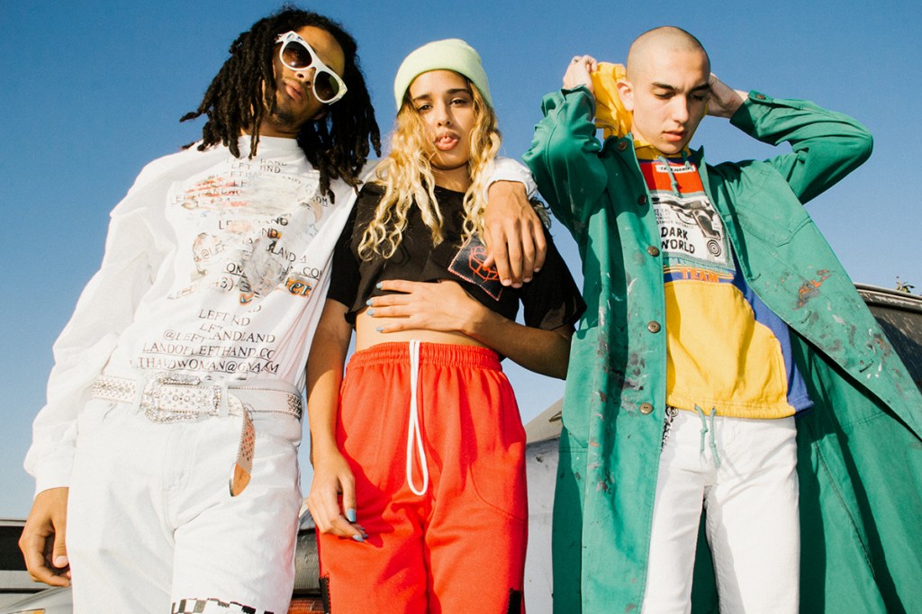 La gamme reste fidèle à l’adn de Left Hand, composée de denim vieilli ou déchiré, de survêtements rapiécés, d’une salopette crue retravaillée et de hoodies crop tops ou T-shirts à longues manches graphiques répondant résolument à la tendance DIY.
